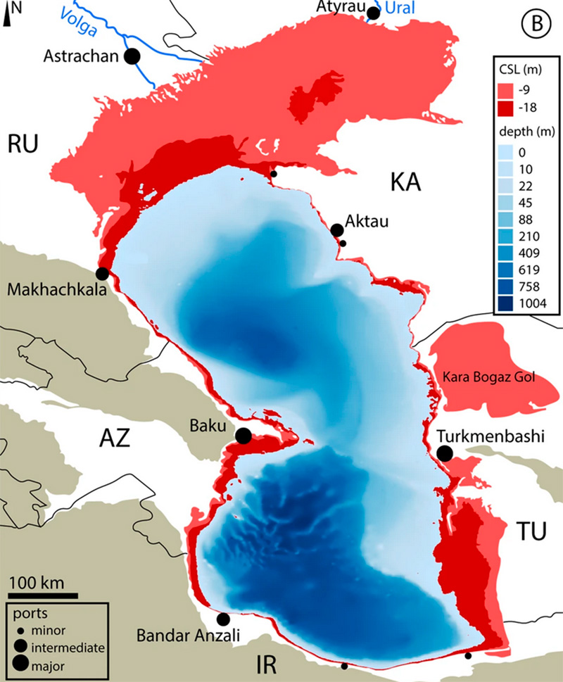 À différentes périodes, la différence entre le niveau minimum et le niveau maximum de la Caspienne pouvait dépasser 15 mètres, et dans un passé lointain, même 50 mètres ou plus, en particulier à l’époque des grandes transgressions, telles que celle de Khvalynskaya, qui s’est produite il y a environ 13 à 18 000 ans. Au cours des deux derniers millénaires, l’amplitude des fluctuations a été supérieure à 15 mètres, la vitesse des changements atteignant parfois 14 centimètres par an.