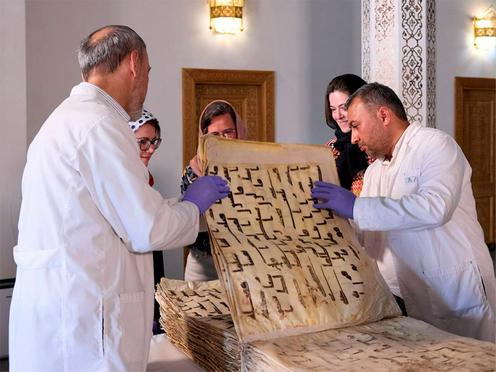 Les restaurateurs examinent le Coran d’Othman, 2024. Photo du service de presse du Fonds pour le développement de la culture et des arts d’Ouzbékistan