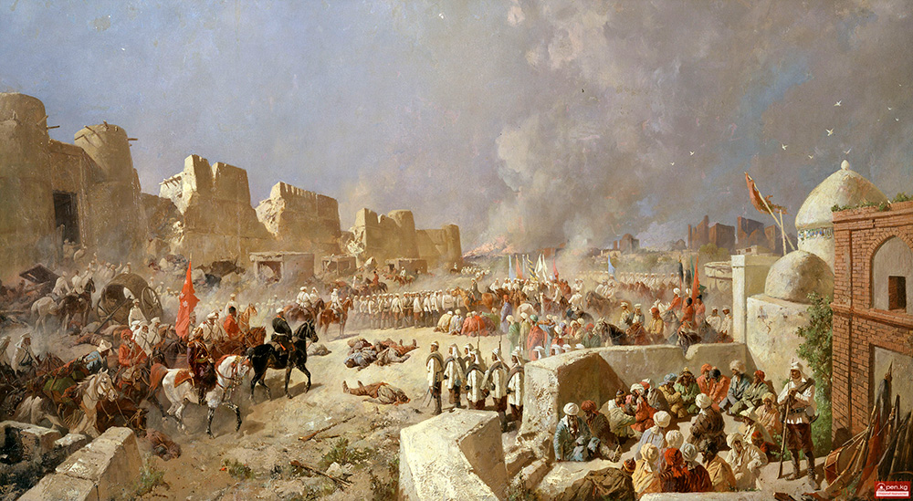 Nikolaï Karazine, « Entrée des troupes russes à Samarcande le 8 juin 1868 ». Photo du site rusmuseumvrm.ru