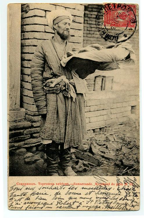Marchand de pain, Samarcande. Carte postale de l’éditeur « Scherer, Nabholz & Cie », années 1900-1910. Collection François Guichard. Archives de Svetlana Gorshenina