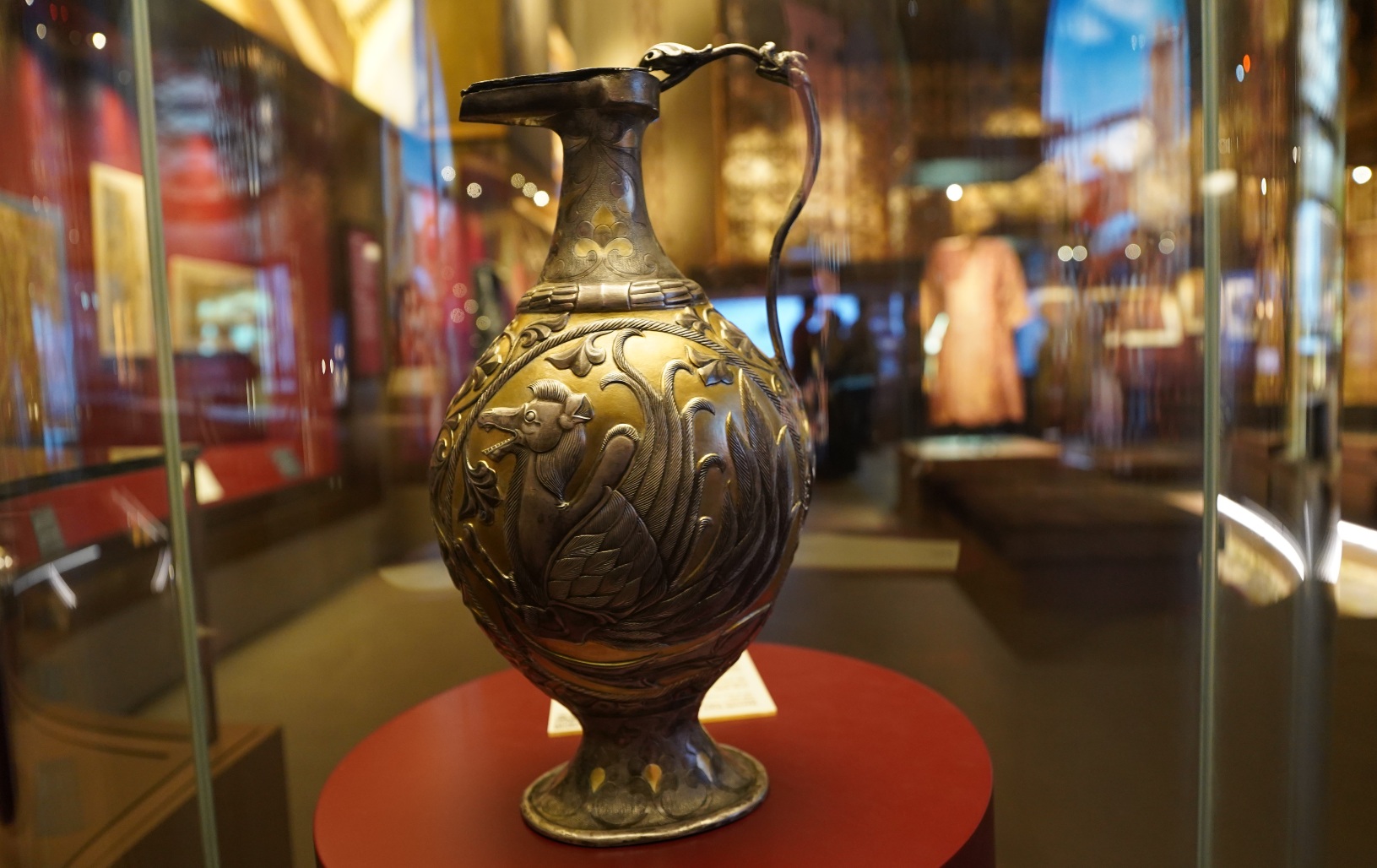 La carafe a trouvé sa place dans l’exposition de la salle consacrée à la période préislamique. Ce récipient fait partie des monuments les plus précieux de l’art du travail des métaux du début du Moyen Âge. Il est caractéristique d'une tradition, très répandue en Asie centrale aux Ve-VIIIe siècles, consistant à décorer les objets métalliques avec des images d’animaux et de créatures mythologiques symbolisant la force, la protection et le bien-être.