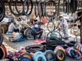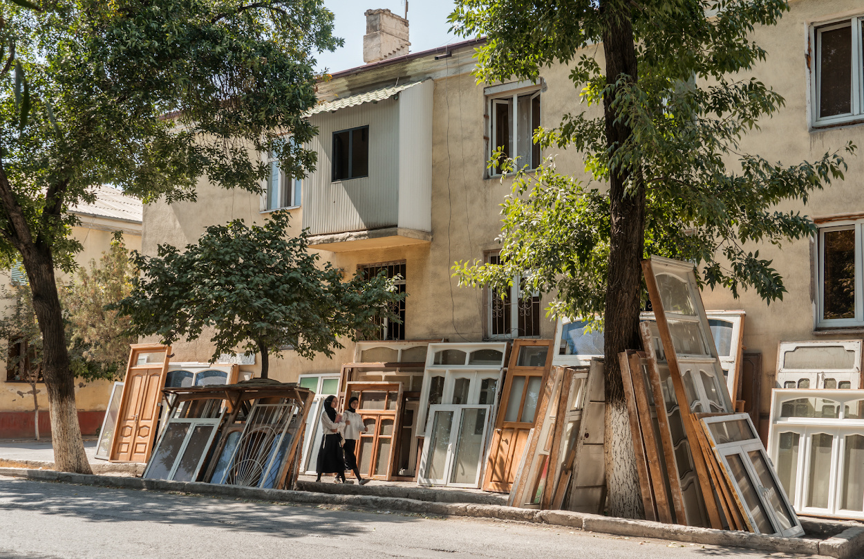 Nous avons fait notre premier arrêt à Marguilan dans une rue où l’on vend des fenêtres et des portes, aussi bien des profilées en plastique modernes que des anciennes, d’occasion, probablement récupérées dans des bâtiments déjà démolis. C’était un spectacle impressionnant.