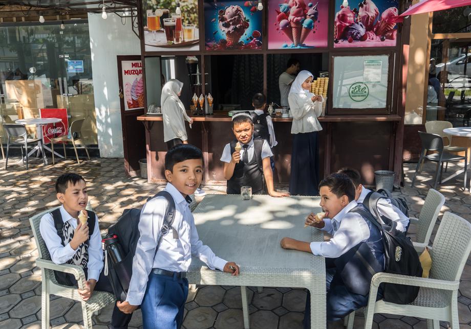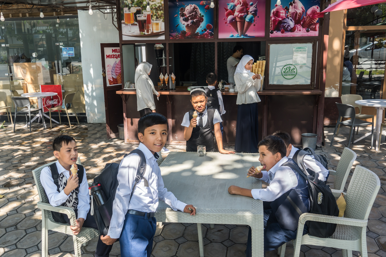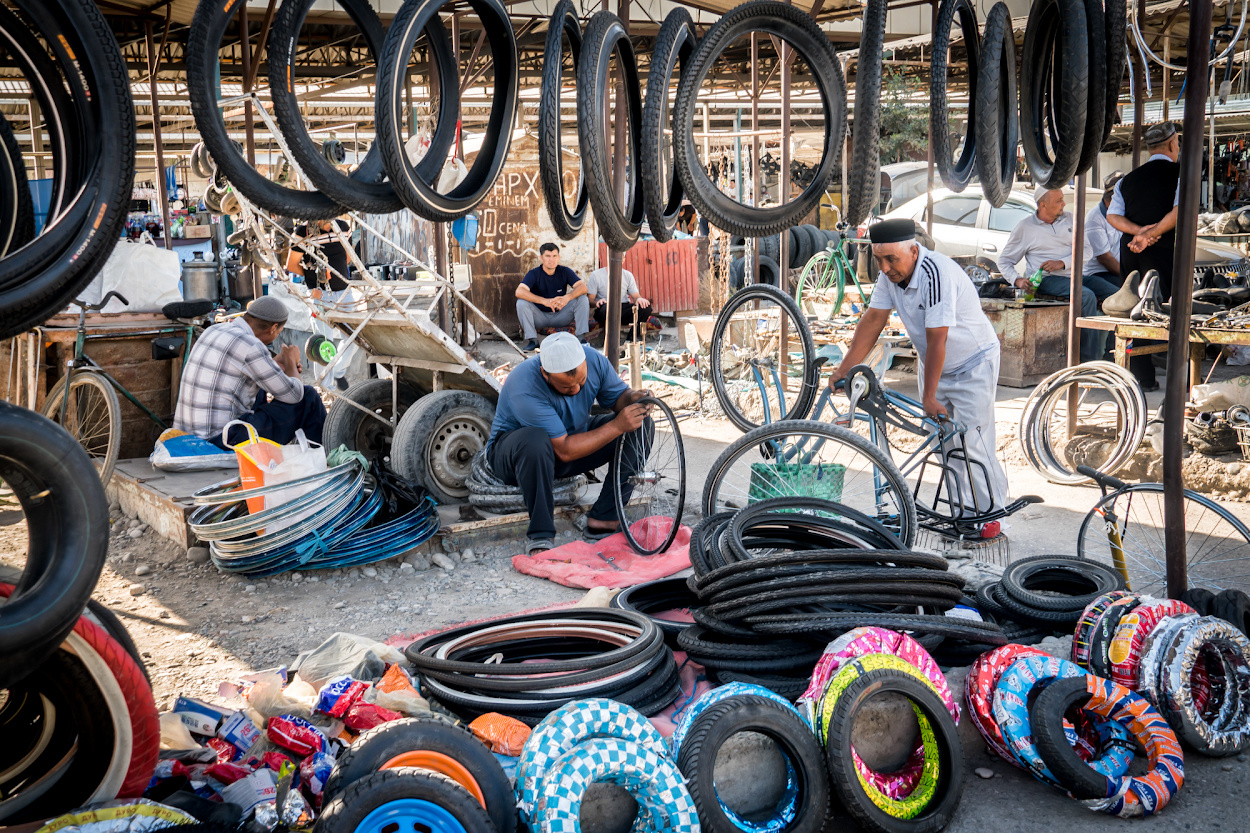 Nous avons pris plaisir à manger une glace en compagnie d’écoliers locaux. Nous avons également remarqué une particularité notable de la vie locale. Les deux-roues jouent un rôle très important dans la circulation routière de Marguilan. Mais il ne s’agit pas de motos, mais principalement de vélos, ainsi que de cyclomoteurs, de scooters et de mobylettes. Cela s’explique probablement par le relief parfaitement plat de la partie centrale de la vallée de Ferghana, qui fait des deux-roues un moyen de transport et de livraison de marchandises très pratique. Dans l’agitation des bazars locaux et des ruelles étroites qui les entourent, les vélos et les scooters se faufilent agilement, comme des petits poissons dans un courant tumultueux.