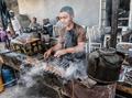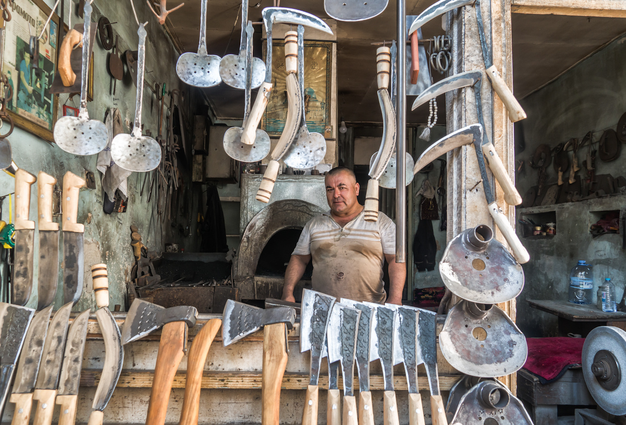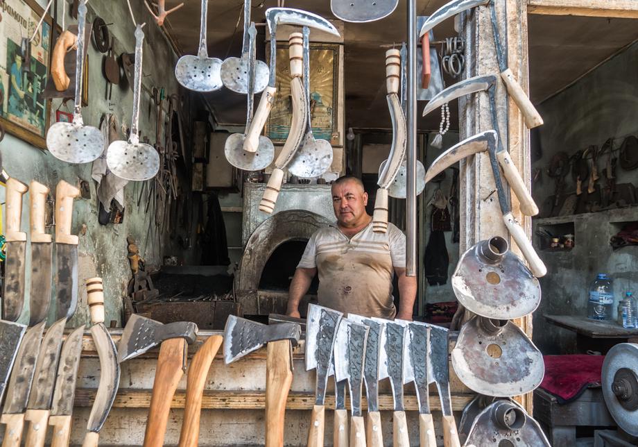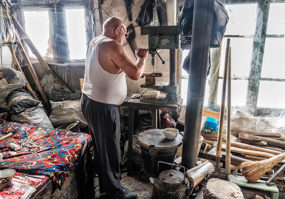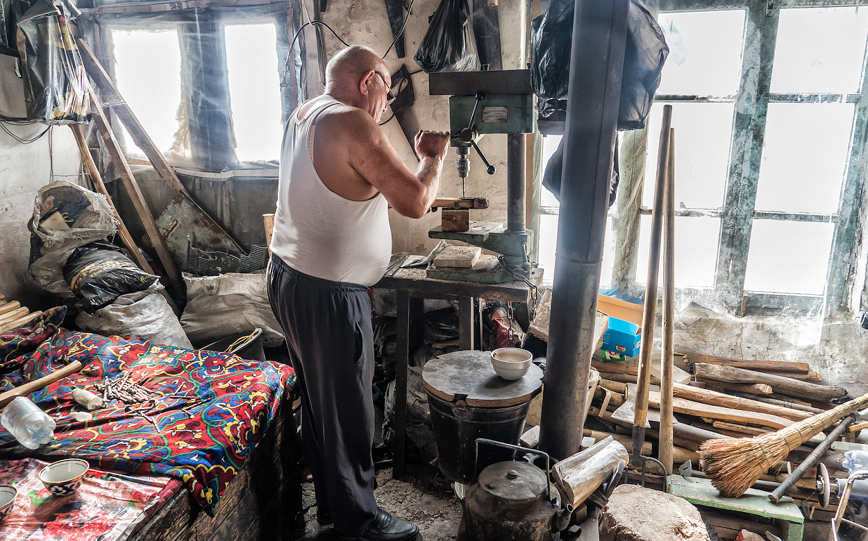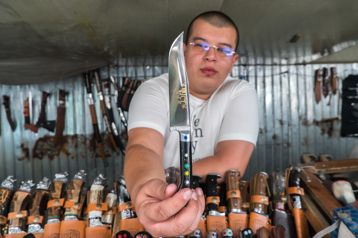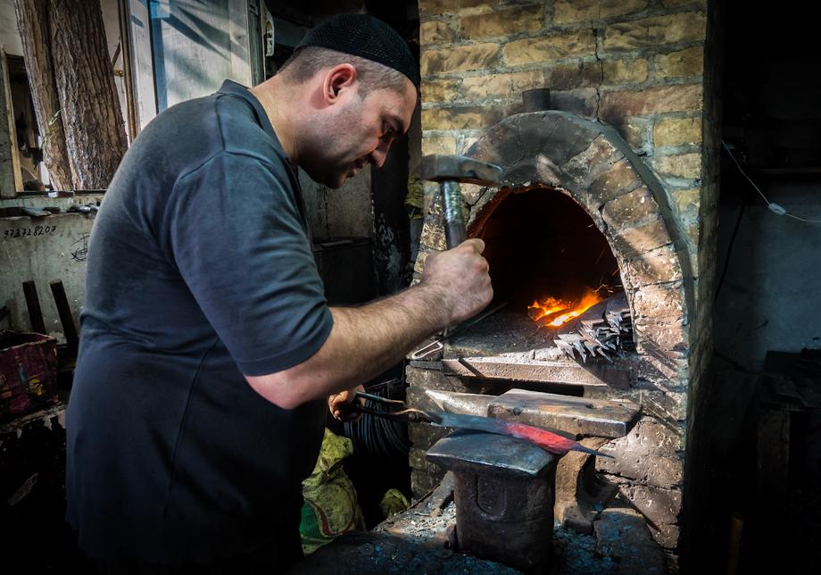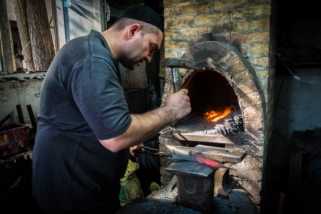 Nous nous sommes ensuite rendus dans la ville de Tchoust, au marché des couteaux traditionnels de Tchoust. Anzor y a trouvé des ateliers de forge avec des forges allumées.