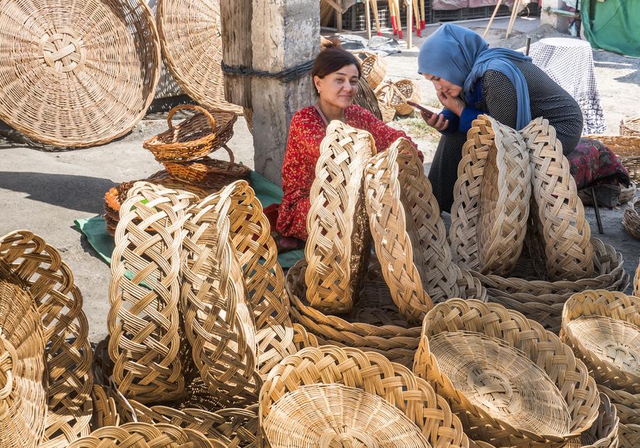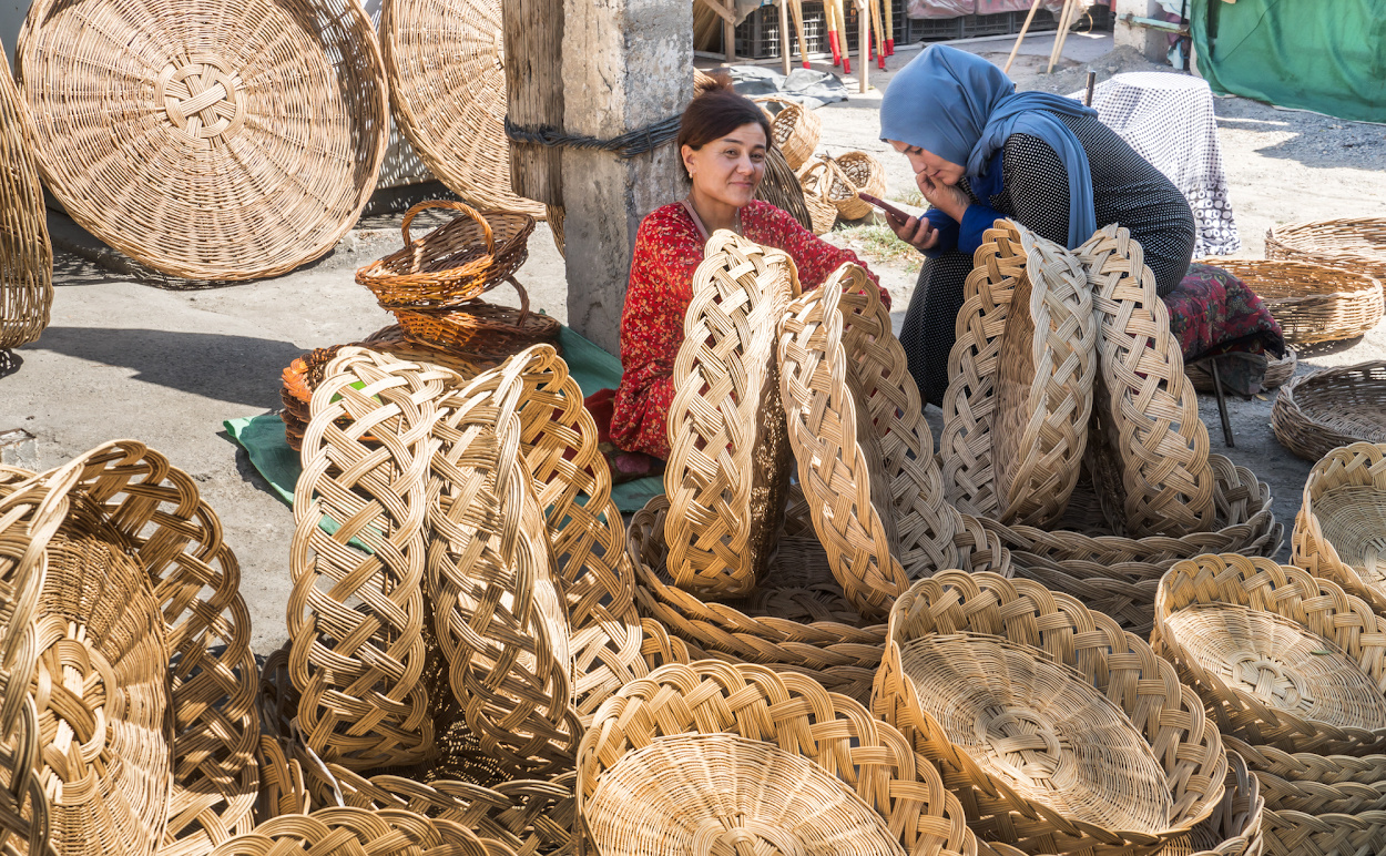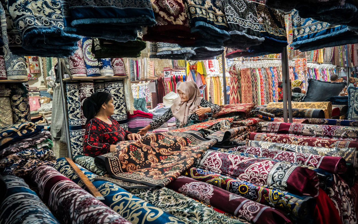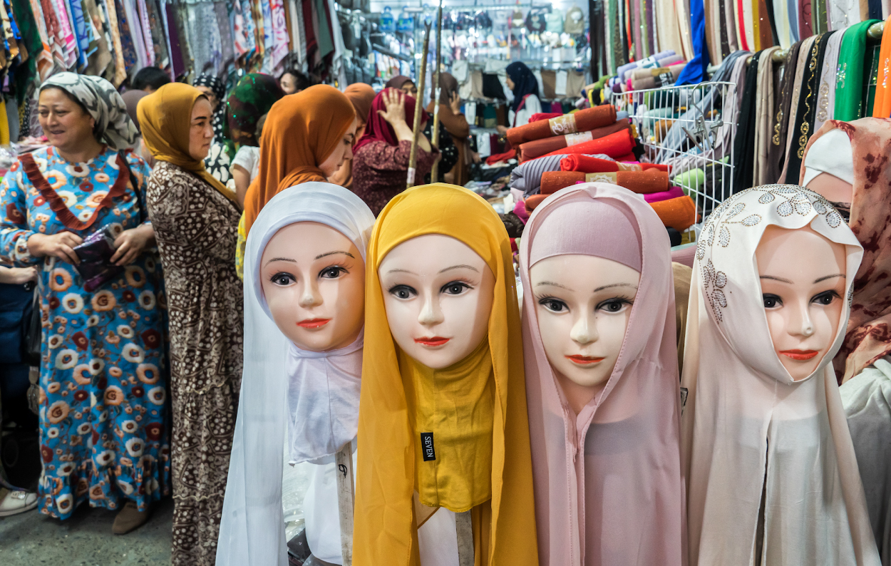 Nous nous sommes ensuite rendus au gigantesque bazar « Kombinatsky ». On y vend des tissus fabriqués dans les manufactures de soieries locales. Mais pas seulement. Tapis, vêtements, linge de lit, produits alimentaires et articles ménagers : tout est mélangé de manière chaotique dans une palette fantaisiste qui donne le vertige.