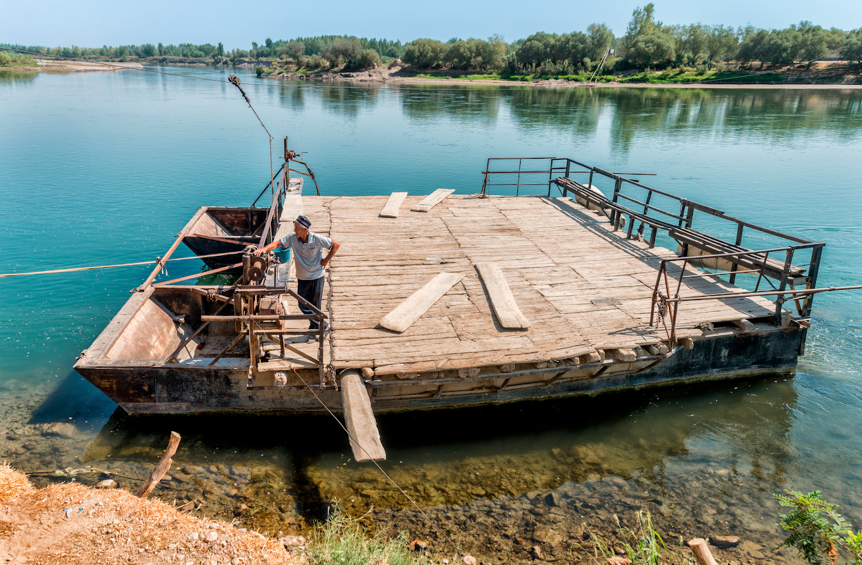 Après avoir rejoint la région de Namangan, nous avons photographié dans le village de Gourumsaray un passeur et un bac automoteur traversant le fleuve Syr-Daria, qui ne fonctionne pas en automne en raison du faible niveau d’eau.