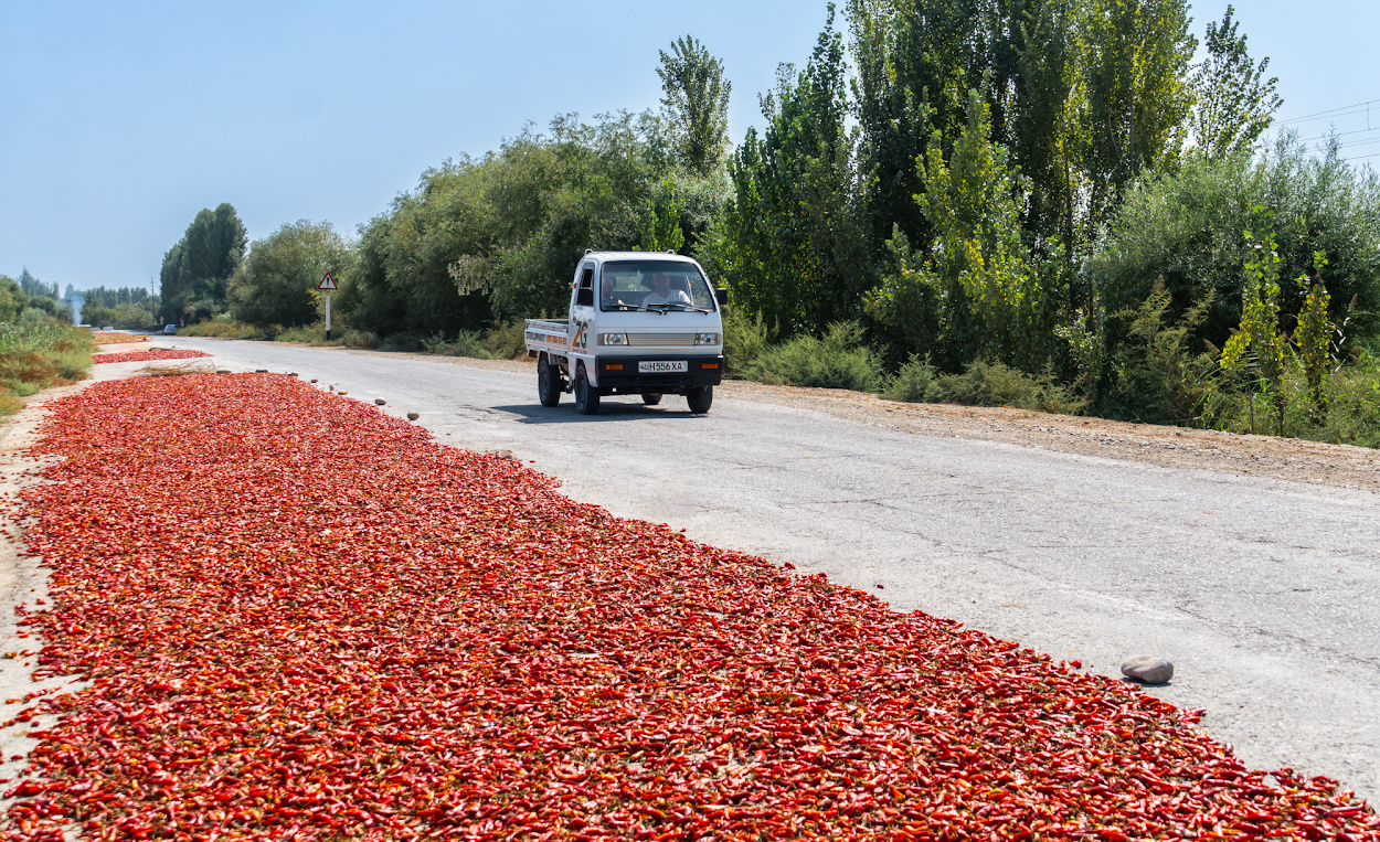 Pour ne pas nous lasser d’une conduite monotone à 70 kilomètres à l’heure, nous avons fait un maximum d’arrêts et de pauses sur le bord de la route. Par exemple, nous nous sommes arrêtés à des endroits où, sur des tronçons peu fréquentés de l’autoroute, les villageois avaient étalé pour sécher les premiers fruits de la récolte : des épis de maïs cueillis ou des piments rouges kalampir. Je n’ai pas réussi à prendre de photos très artistiques, mais j’ai tout de même pu immortaliser cette caractéristique intéressante de la vie quotidienne.